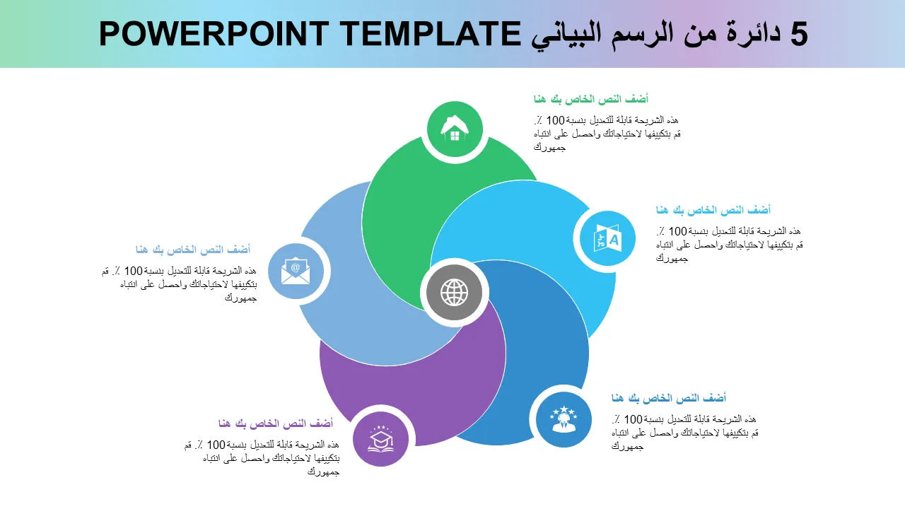 قالب PowerPoint احترافي مكون من 5 دوائر لمخطط Venn مصمم لتصور تقاطعات استراتيجية العمل المعقدة. مثالي للتخطيط الاستراتيجي والتحليل التنافسي والعروض التقديمية لتجزئة السوق.
