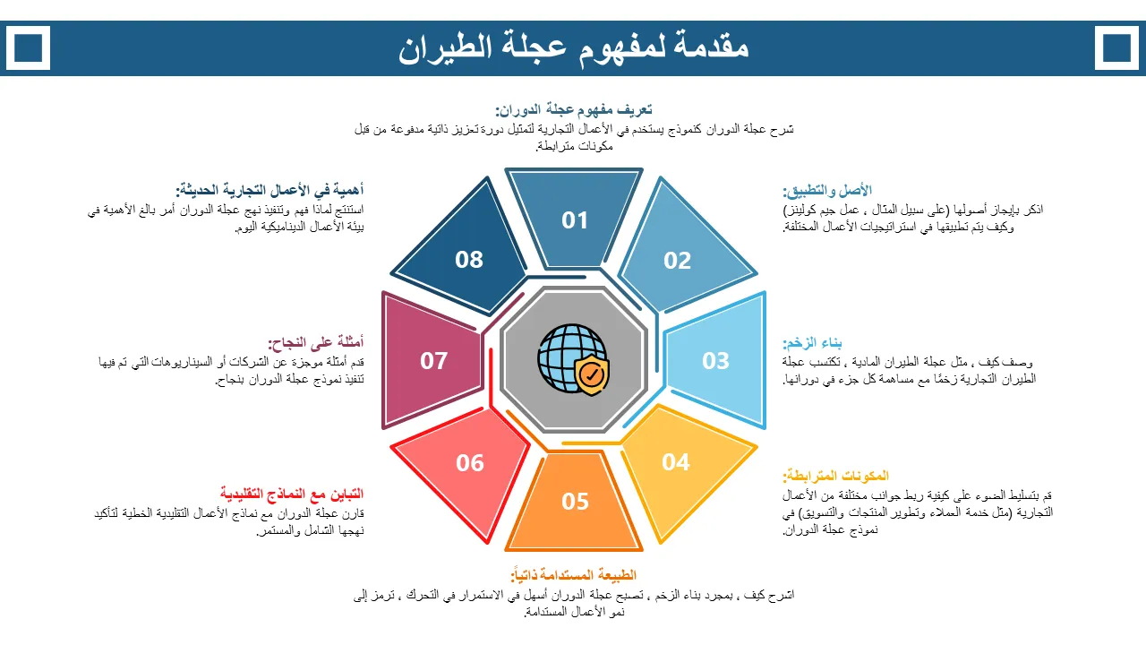 تصور دورات الأعمال ذاتية التعزيز باستخدام قالب PowerPoint المكون من 8 عناصر لمخطط دولاب الموازنة. مثالية للعروض التقديمية لاستراتيجية النمو وطوابق المستثمرين والتخطيط التشغيلي.