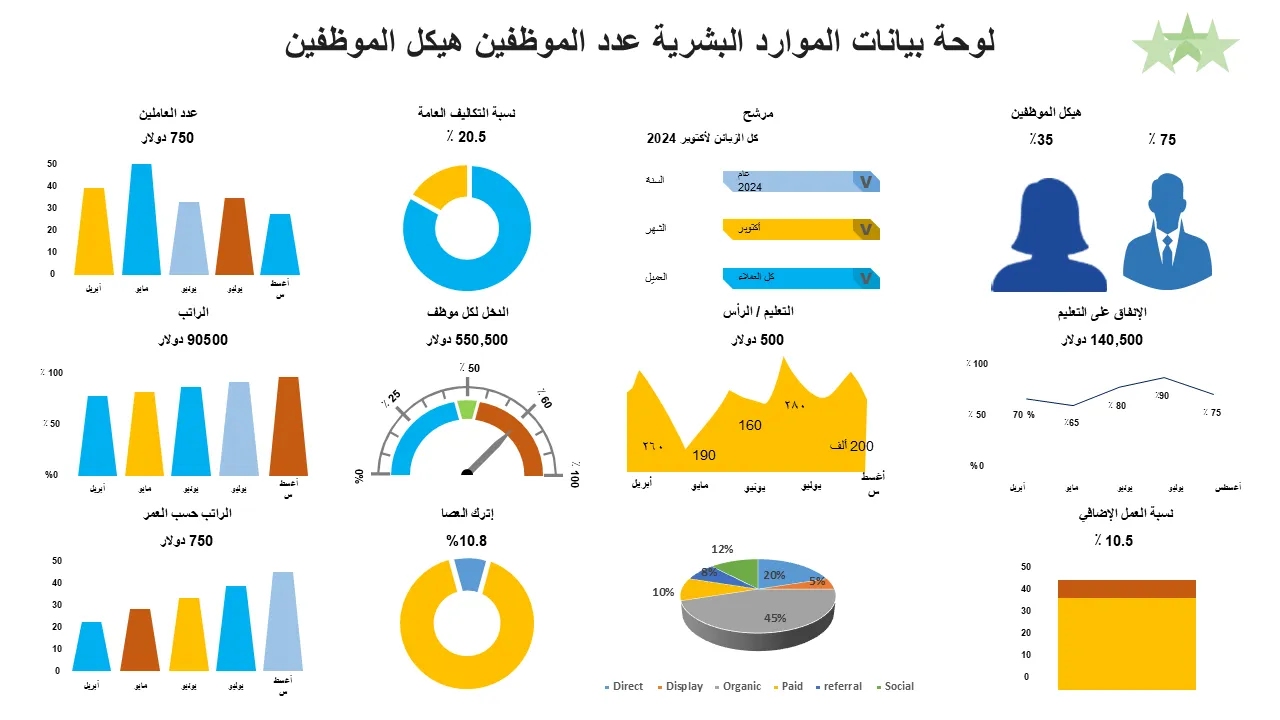 لوحة تحكم شاملة للموارد البشرية عدد الموظفين هيكل الموظف لفرق الموارد البشرية والمديرين. مثالية لتأهيل الموظفين وخطط التدريب ومراجعات الأداء والتطوير التنظيمي. شرائح قابلة للتخصيص بالكامل.