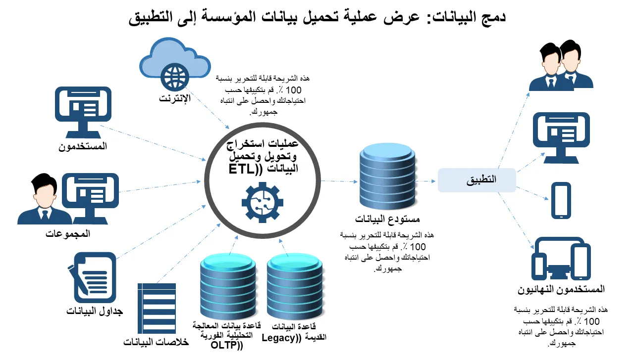 تكامل بيانات مصمم بشكل احترافي يُظهر تحميل بيانات المؤسسة مع التطبيق والمستخدمين النهائيين لعروض تحليلات البيانات. شرائح قابلة للتحرير بتصميم حديث، مثالية لمحترفي الأعمال والمستشارين وفرق العمل. حقيقة التخطيط النظيف ...