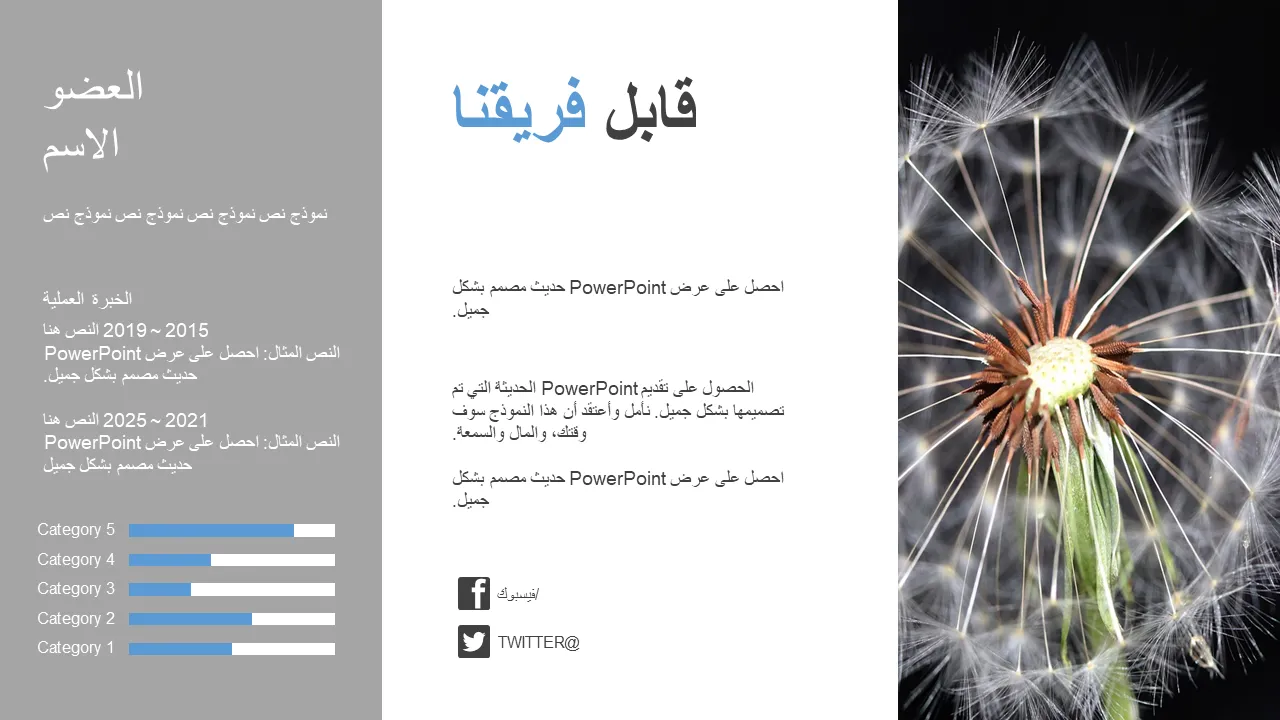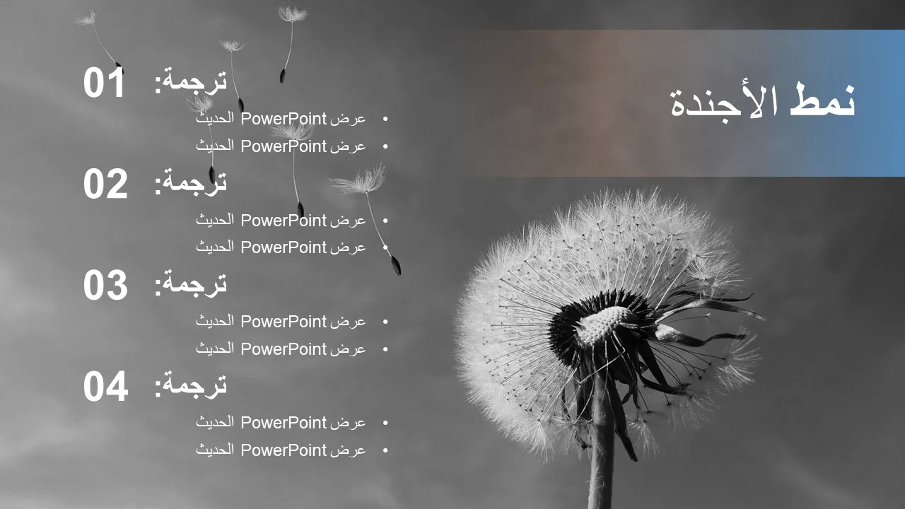 يستخدم قالب PowerPoint الأنيق هذا استعارة بذور الهندباء التي تهب في مهب الريح لترمز إلى النمو والتشتت والتوسع الاستراتيجي. وهو مثالي للعروض التقديمية الخاصة باستراتيجية الأعمال، فهو يمثل بشكل مرئي كيفية انتشار الأفكار والأسواق والفرص بشكل عضوي عبر المناطق أو قواعد العملاء. يمزج التصميم بين الجماليات الحديثة والصور الطبيعية لإنشاء مجموعات لا تُنسى وجذابة تلقى صدى لدى الجماهير.