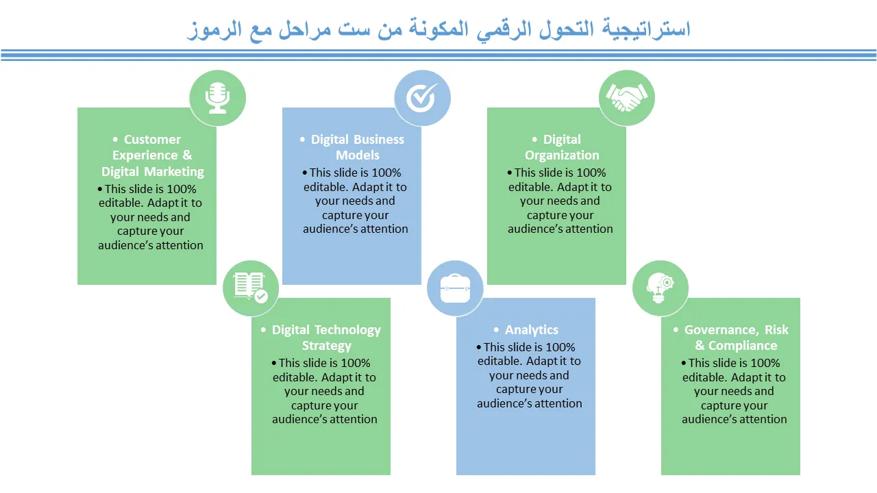 - الشرائح المنسقة مسبقًا لركائز الإستراتيجية الرقمية: اعتماد التكنولوجيا، والتغيير التنظيمي، التحليلات
