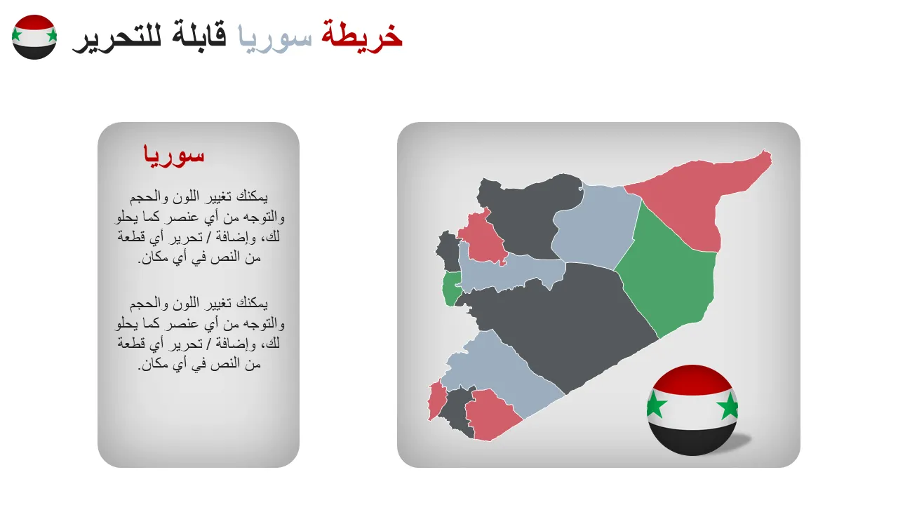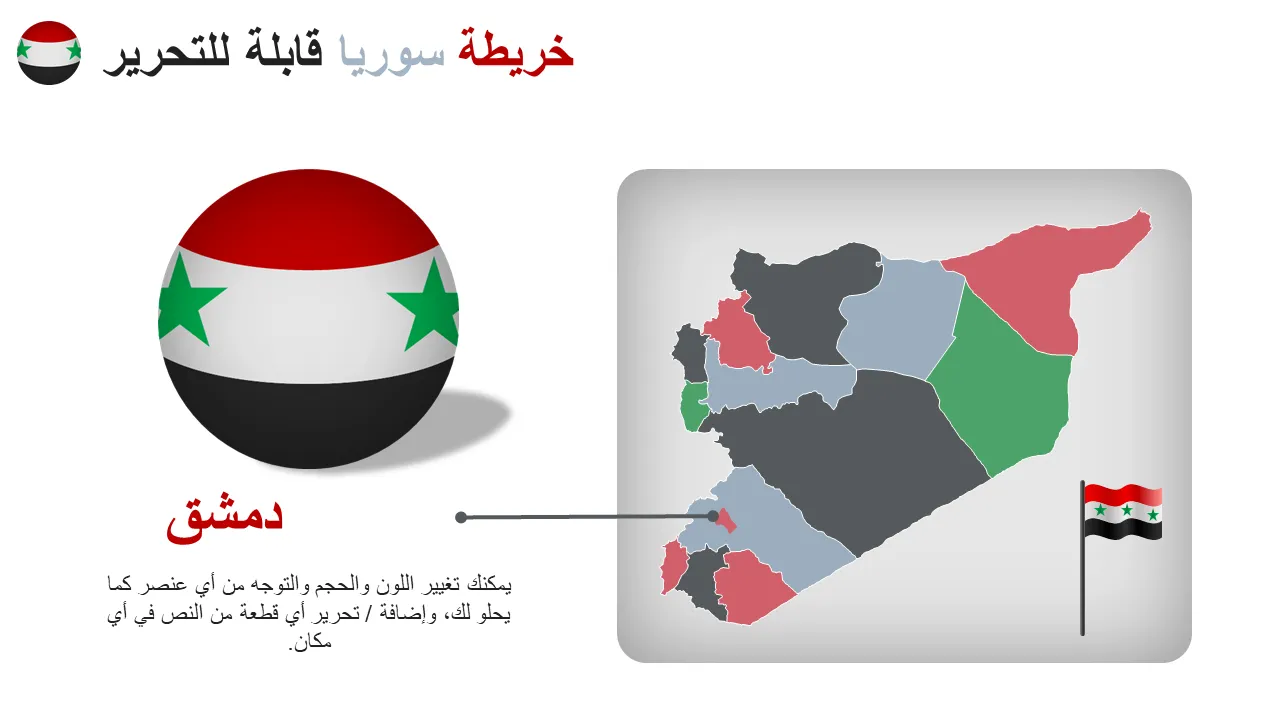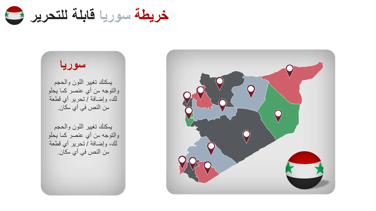 يستخدم محللو الأعمال والمستشارون والاستراتيجيون الإقليميون هذا القالب لتقديم نتائج أبحاث السوق أو خرائط تقسيم العملاء أو لوجستيات سلسلة التوريد في سوريا. وهو مفيد بشكل خاص للمنظمات غير الحكومية والشركات الدولية والوكالات الحكومية العاملة في المنطقة. يستفيد المسؤولون التنفيذيون الذين يقومون بإعداد تحديثات المستثمرين أو مجموعات استراتيجيات الشركة من تخطيطها النظيف وجماليتها الاحترافية.