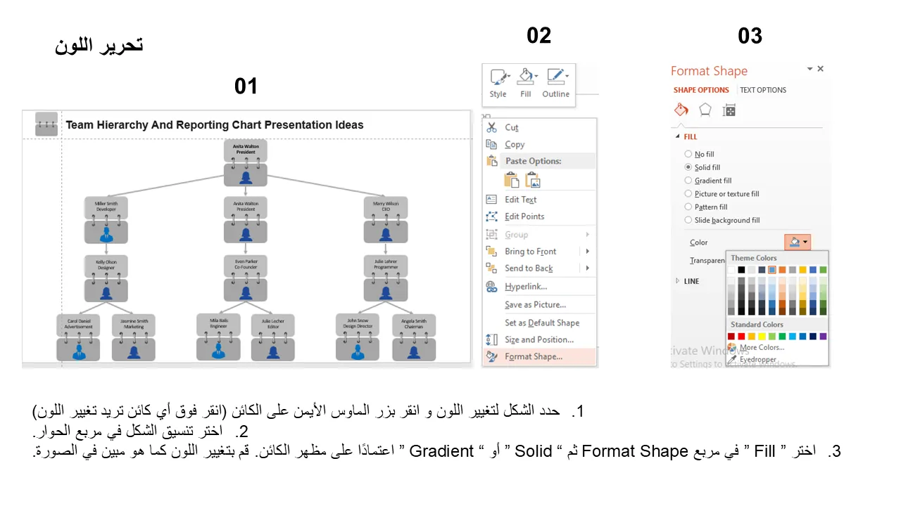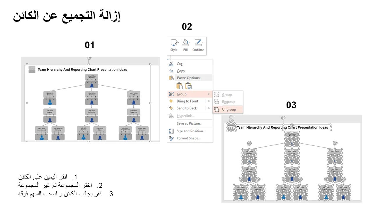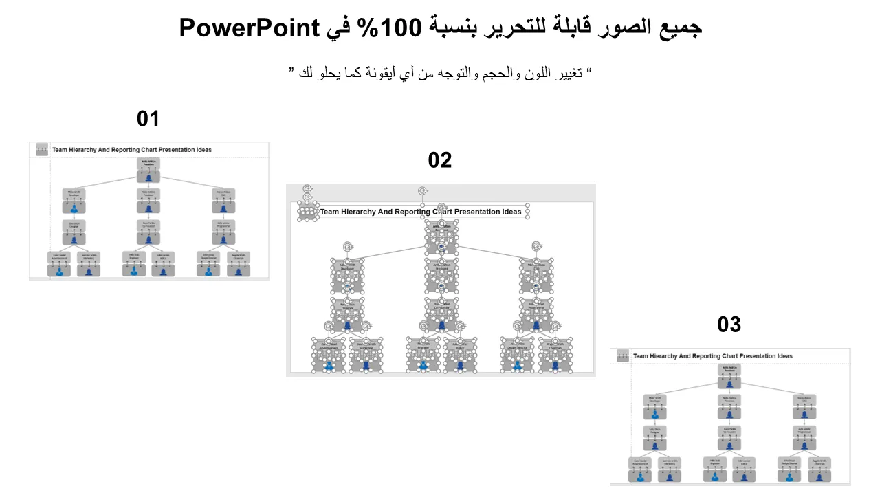 شرح أفكار العرض التقديمي للتسلسل الهرمي للفريق ومخطط التقارير