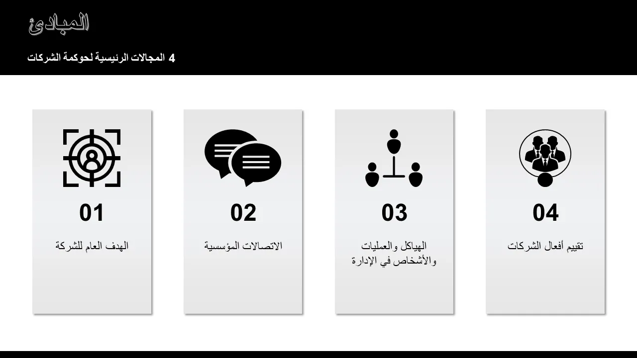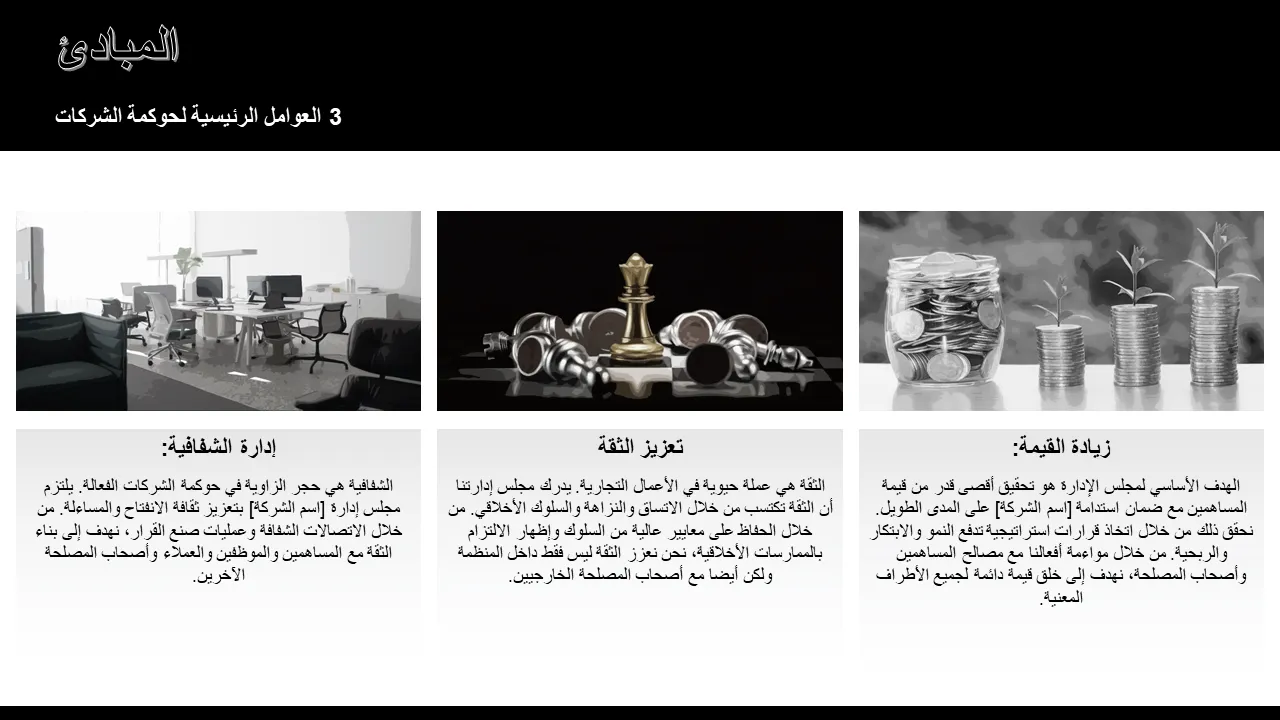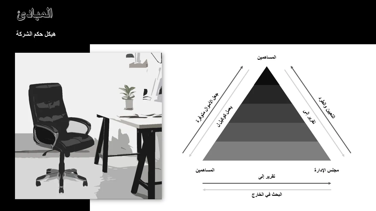 - شرائح إطار الحوكمة المصممة مسبقًا مع التسلسل الهرمي المرئي لأدوار مجلس الإدارة ومسؤولياته