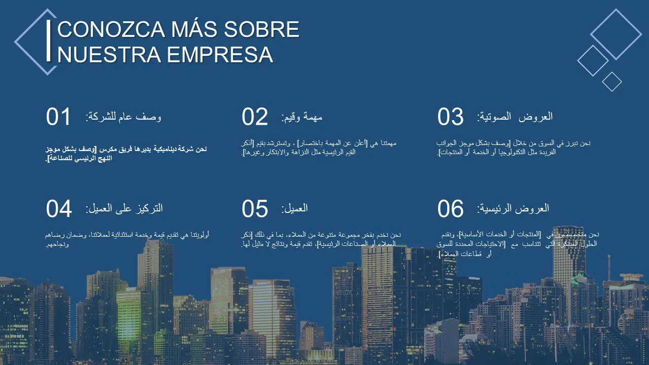 تستخدم الشركات عبر الصناعات مثل الاستشارات والتكنولوجيا المالية والرعاية الصحية هذا القالب لتقديم علامتها التجارية للمستثمرين أو العملاء أو الموظفين. إنه مفيد بشكل خاص أثناء جولات جمع التبرعات، أو المراجعات التنفيذية، أو إعداد الشركات. ويستفيد قادة الفرق ومديرو التسويق والمؤسسون من قدرتها على عرض هيكل الشركة ورسالتها وخبرة الفريق بتنسيق مصقول.